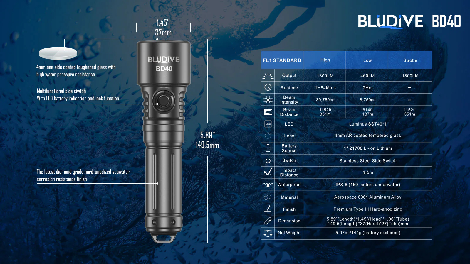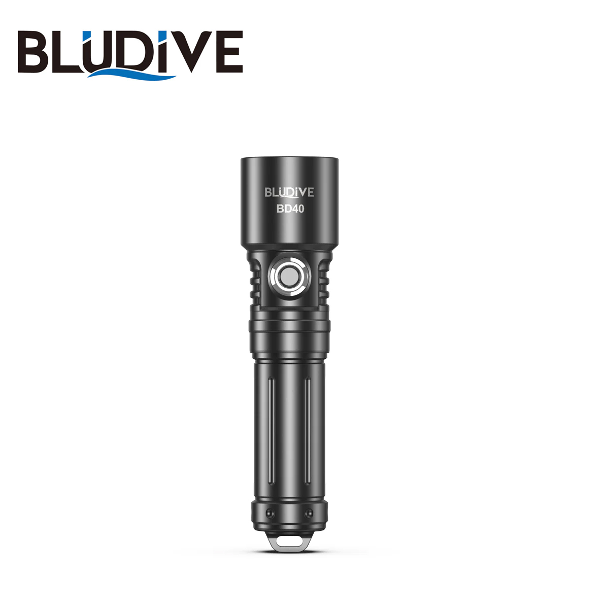 The Bludive BD40 is a high performance LED dive torch & has a max output of 1800 lumens, meanwhile the 6000K LED color temperature provides superb color rendition. SMO reflector emits a concentrated beam at 6 degrees. Powered by 1* 21700Lithium battery, max runtime can reach 7hours.