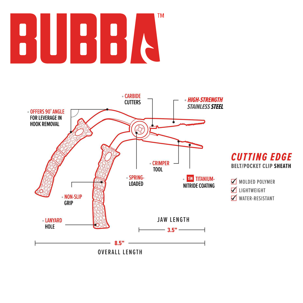 The Bubba Stainless Steel Pistol Grip Pliers bring a new level of strength and durability to fishing pliers. Developed with premium, high-carbon stainless steel and a titanium nitride coating, these pliers are purpose-built to withstand extreme duress and resist corrosion. They feature a unique 90 degree angle to make it easy to get to those hard to reach areas