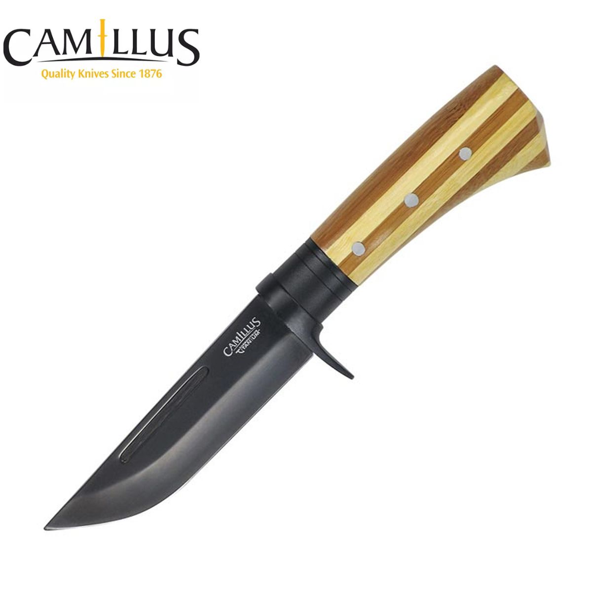 The Camillus 9.75” Carbonitride Titanium Fixed Blade Knife with Bamboo Handle and Nylon Sheath won’t flake, blister, chip or peel and is up to 10x harder than untreated steel so the blades stay sharper, longer. Hollow ground fixed blade. Ergonomic, Eco-friendly 2-tone Bamboo handle.
