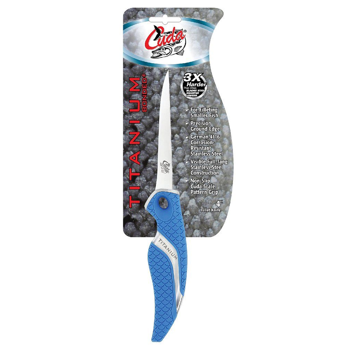 The Cuda 4" Fillet Knife is built to last. The precision ground knife blade is exceptionally durable, and it boasts a full-tang construction with German 4116 corrosion resistant stainless steel. Additionally, the blade is titanium bonded, making it 3x harder than untreated stainless steel while ensuring unparalleled edge retention.Â