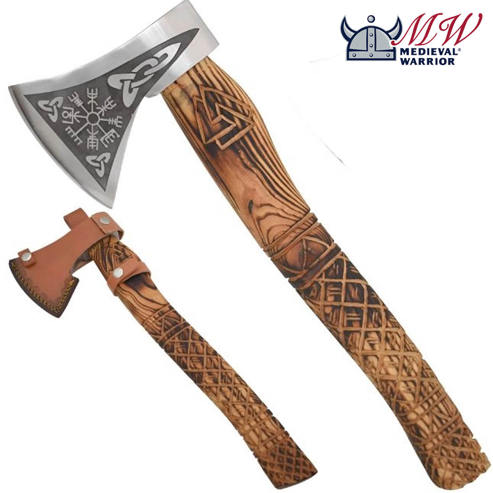 Showcase your collection with the Medieval Warrior Viking Axe—crafted for display only, featuring a high-carbon steel etched blade, ash wood handle, and leather sheath.
