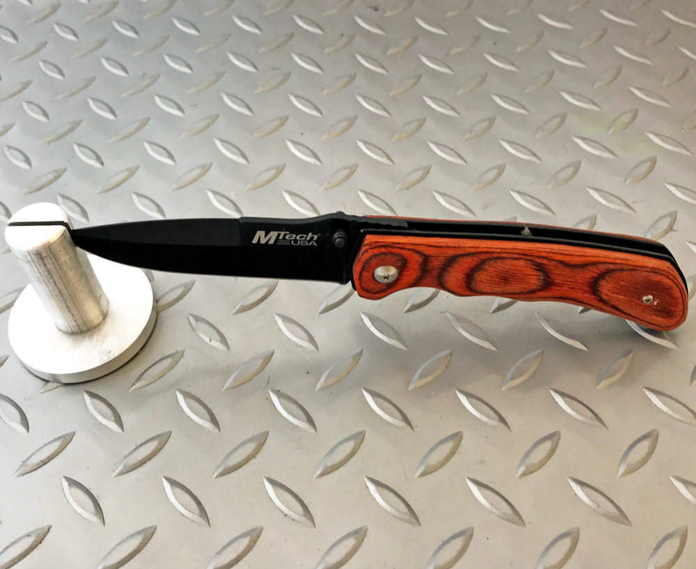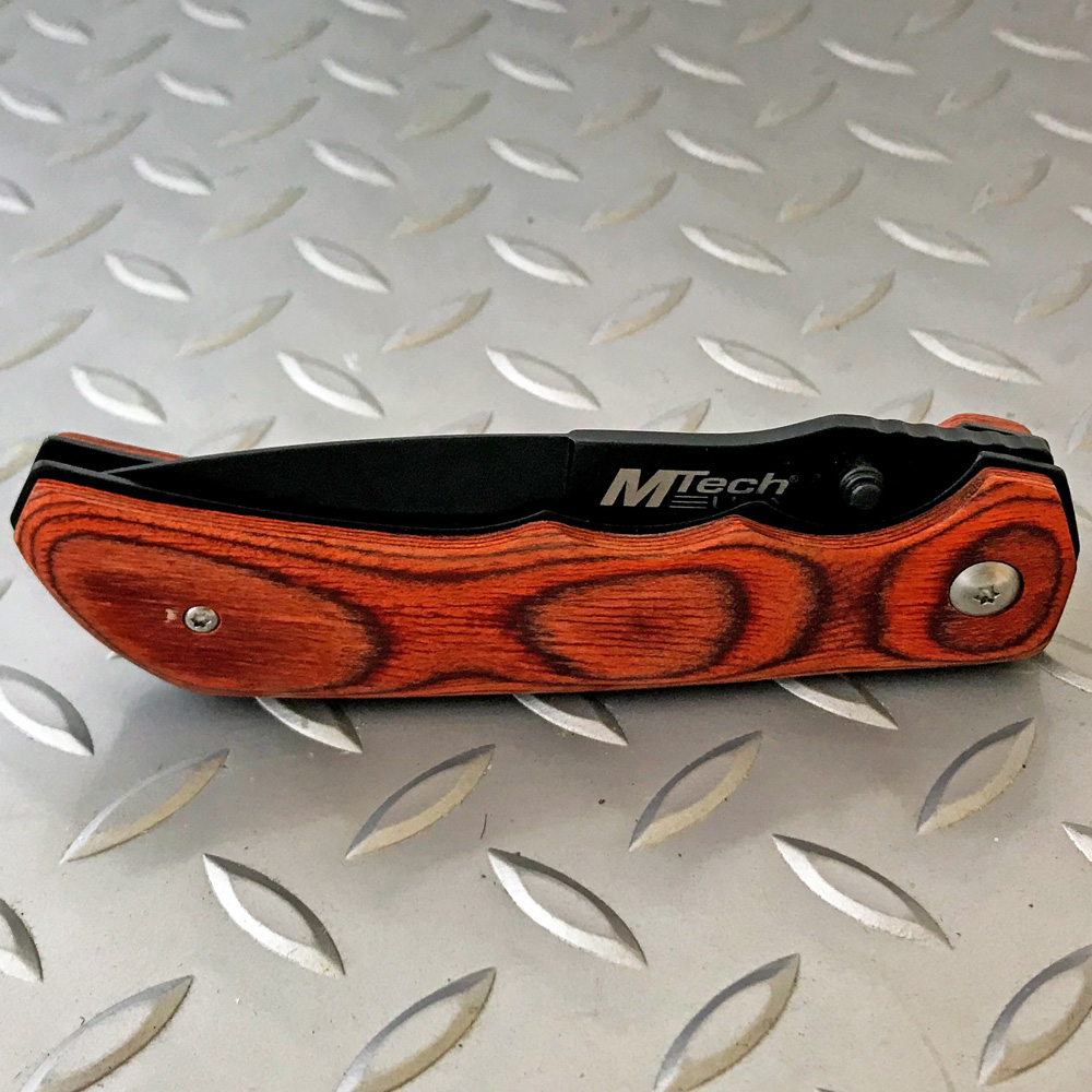 MTech Pakka Wood Handle Pocket Knife has an all black finish blade and trim with a brown pakka wood handle.