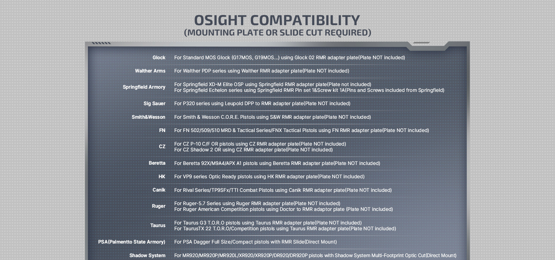- Most Common Footprint: By adopting the most common industry-standard mounting footprint (Ruggedized Miniature Reflex, 407c/507c footprint) for optic cuts, Osight ensures versatility and ease of integration.