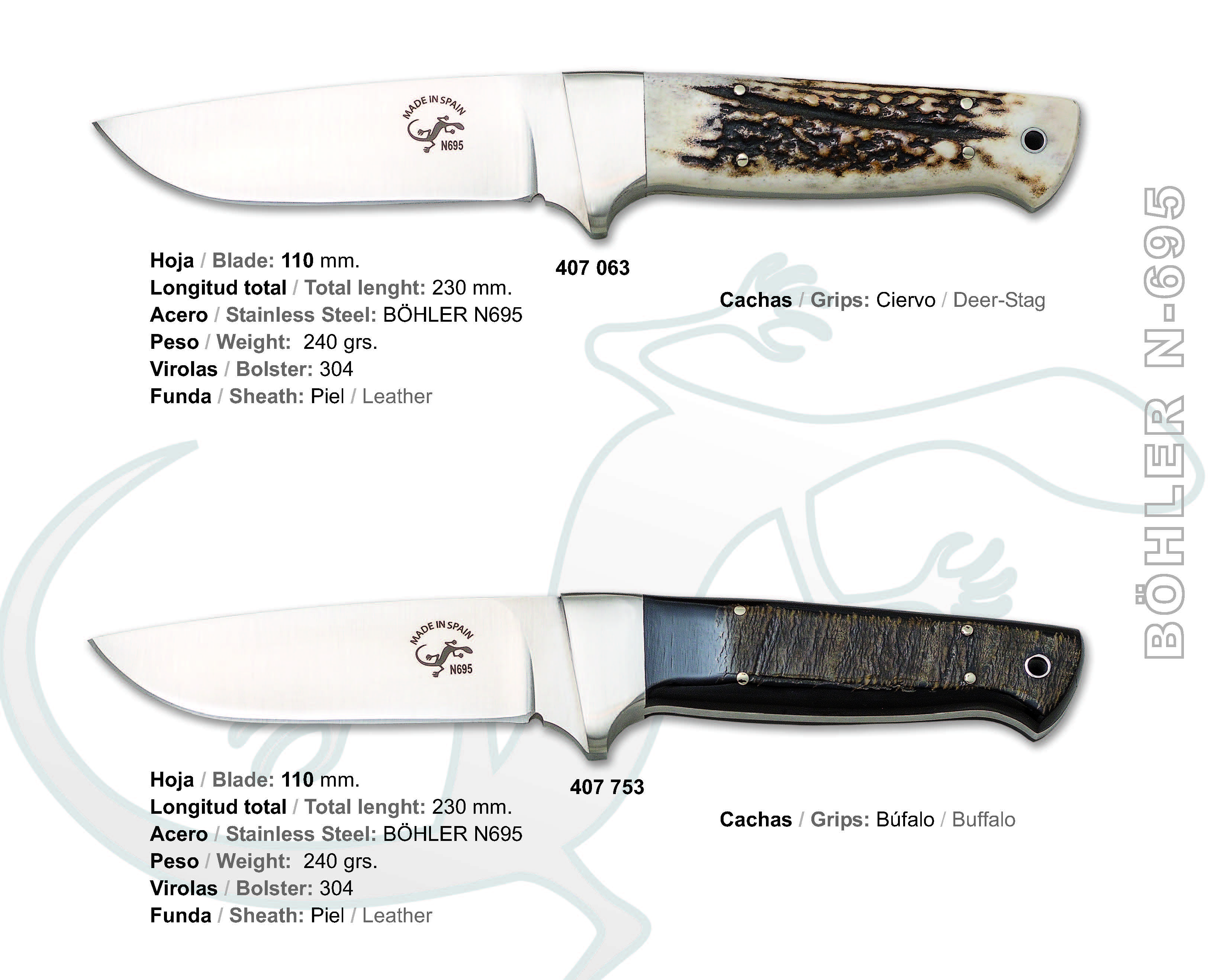 This Salamandra general purpose hunting knife is hand crafted in Spain. The BOHLER N695 Stainless Steel Blade boasts superb quality with a high class finish Buffalo Horn handle and hand made brown leather sheath.This knife is built to work hard and last a lifetime.Â