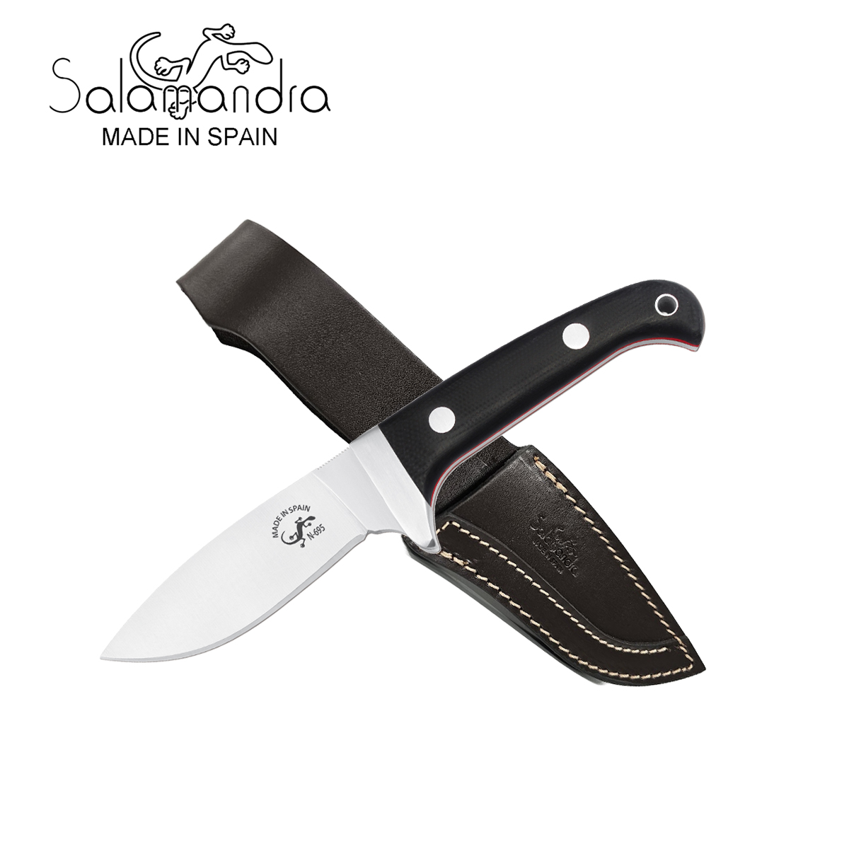 This Salamandra hunting knife is hand crafted in Spain. The BOHLER N695 Stainless Steel Blade boasts superb quality with a high class finish G10 handle and hand made brown leather sheath. This knife is built to work hard and last a lifetime.