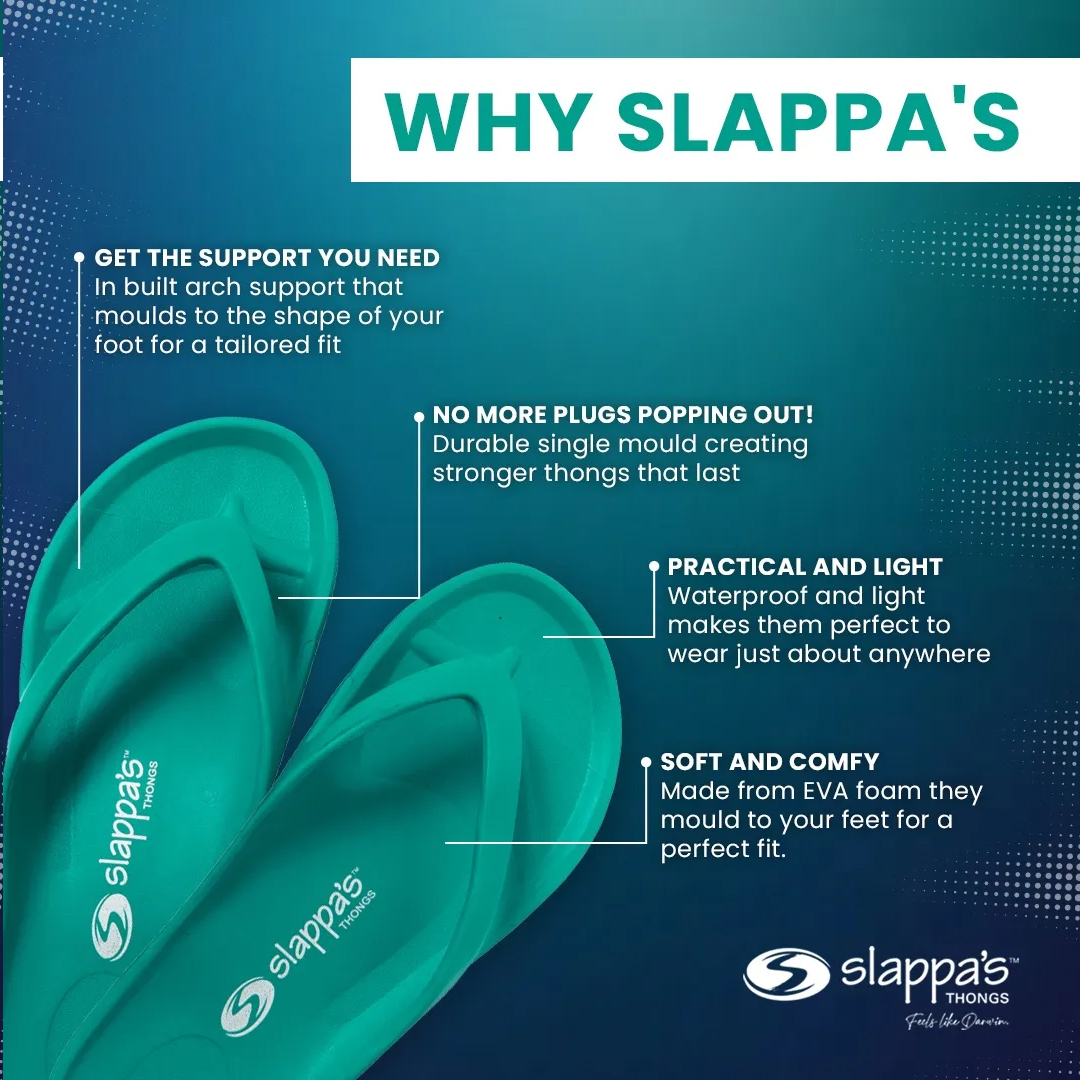 Slappa’s thongs are a super comfy pair of thongs made out of EVA foam. Non-slip design and as you wear them, they will soften and mould to your foot shape. Slappa's thongs have great arch support, are extremely light, very durable and will relax your tired feet.