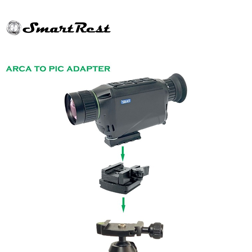The SmartRest Arca to Pic adapter is an Arca Base with a Pic rail clamp for thermal cameras.