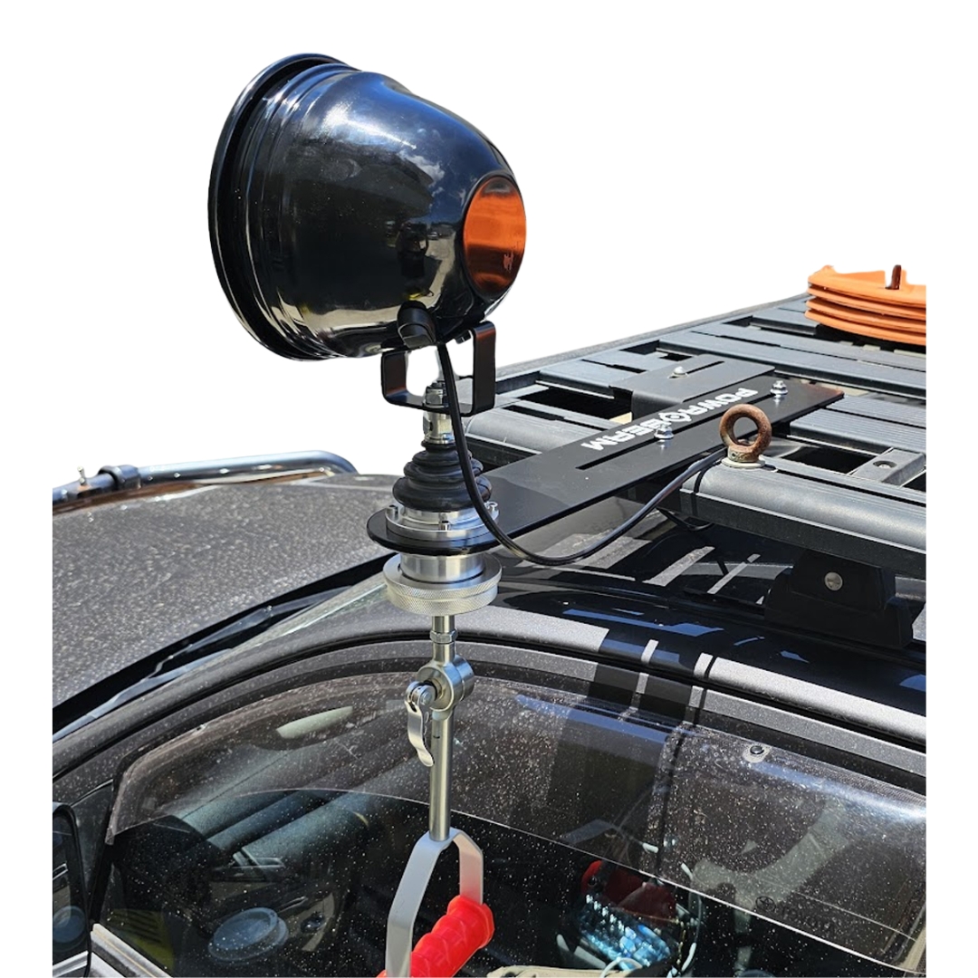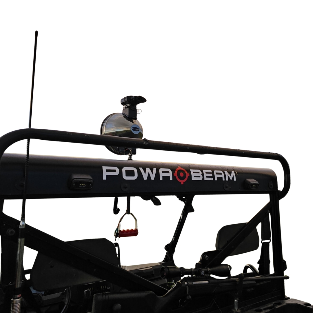 The Powa Beam Roof Mount is a waterproof mount designed to fit a spotlight onto the top of a dedicated work vehicle's roof (often a work ute or ATV), so that the spotlight is easily accessible from the driver's seat and can be aimed in any direction. This is the preferred choice for hunting and farming rigs.