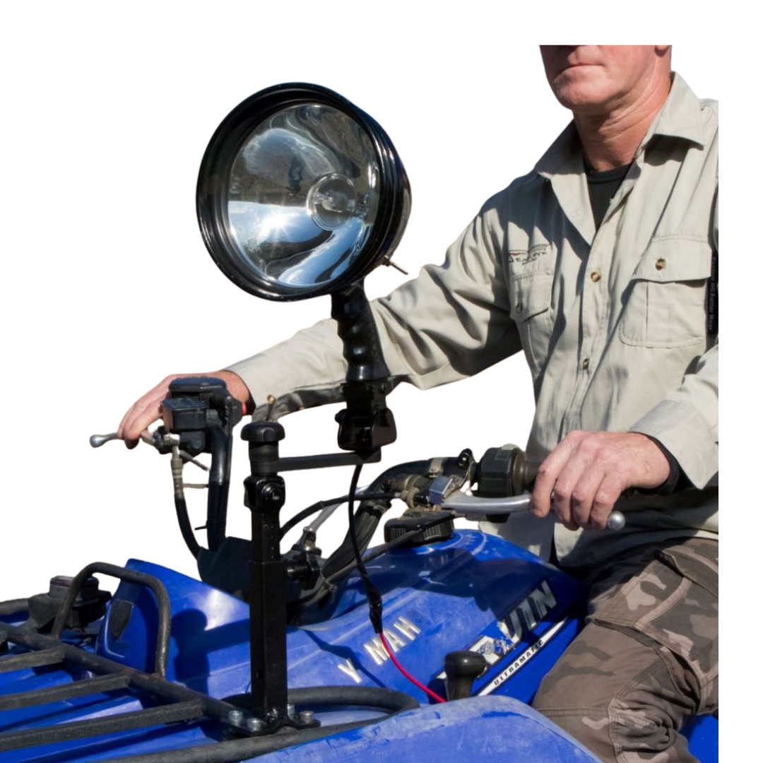 The Smartrest Light Mount is a system that connects onto a bar, and is primarily designed for use on a quad bike with a hand-held spotlight. The advantage of this setup is to be able to maneuver or detach a spotlight quickly while on the hunt.