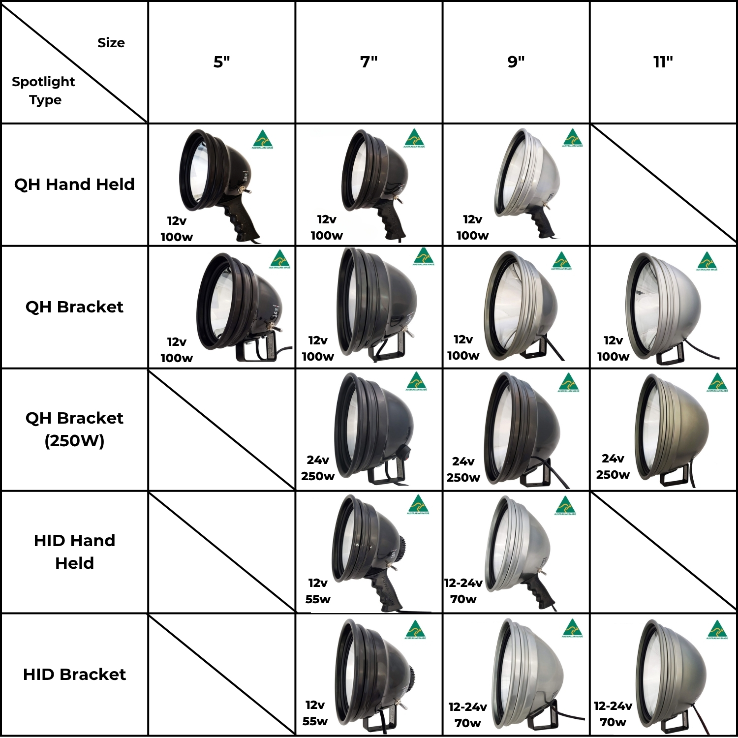 Below is a chart displaying the current range of spotlights available, by size and type.